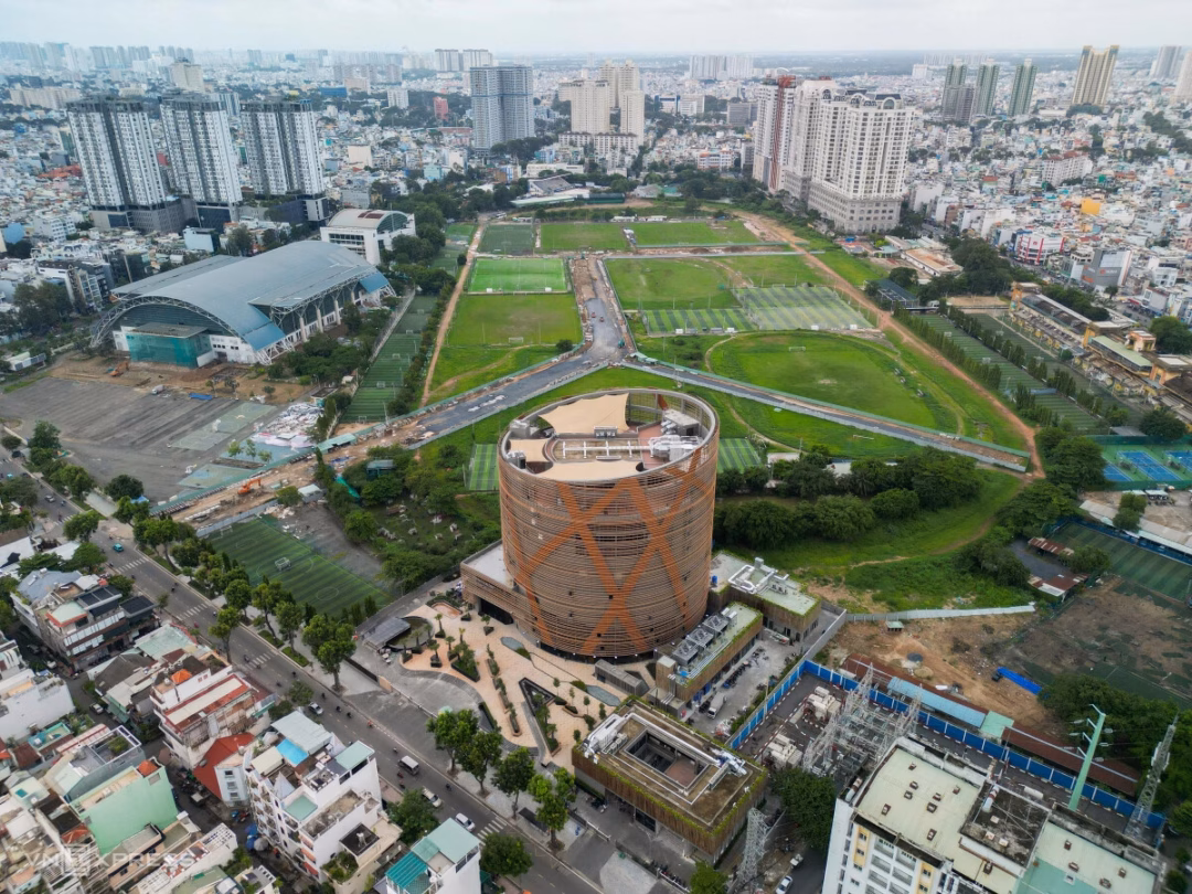 Rạp xiếc và biểu diễn đa năng Phú Thọ được thiết kế kiểu hình trụ tròn, trên diện tích đất khoảng 10.000 m2, bao gồm hai tầng hầm và 12 tầng nổi. Chiều cao công trình đạt 57,5 m, diện tích sàn sử dụng hơn 31.000 m2. Khán phòng chính có sức chứa 2.000 chỗ, được trang bị sân khấu tròn di động và sân khấu hình chữ nhật, cùng với hệ thống nâng xoắn ốc hiện đại.