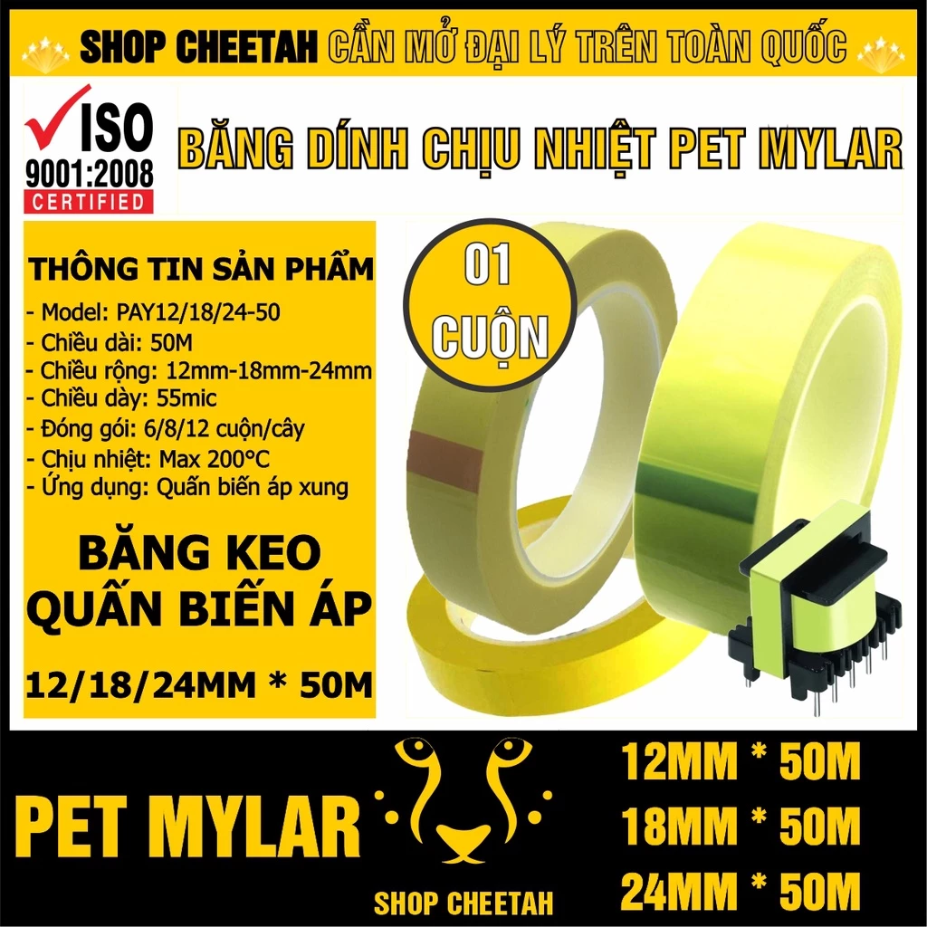 - Băng keo Mylar: Đây là loại băng keo cách nhiệt phổ biến nhất cho biến áp xung, với khả năng chịu nhiệt lên đến 200°C.